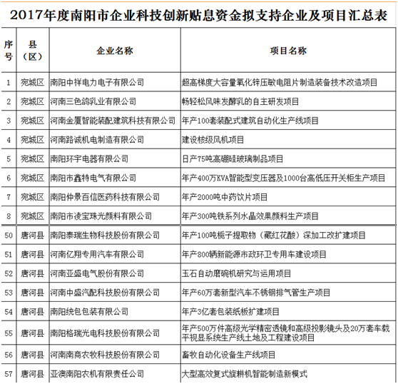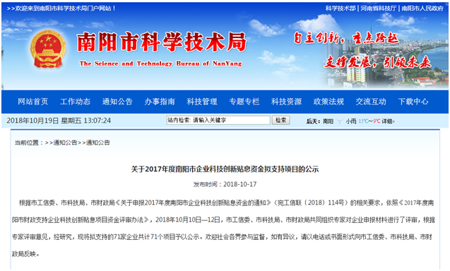 根據(jù)市工信委、市科技局、市財(cái)政局《關(guān)于申報(bào)2017年度南陽(yáng)市企業(yè)科技創(chuàng)新貼息資金的通知》(宛工信聯(lián)〔2018〕114號(hào))的相關(guān)要求,依照《2017年度南陽(yáng)市財(cái)政支持企業(yè)科技創(chuàng)新貼息項(xiàng)目資金評(píng)審辦法》,2018年10月10日—12日,市工信委、市科技局、市財(cái)政局共同組織專家對(duì)企業(yè)申報(bào)材料進(jìn)行了評(píng)審,根據(jù)專家評(píng)審意見(jiàn),經(jīng)研究,現(xiàn)將擬支持的71家企業(yè)共計(jì)71個(gè)項(xiàng)目予以公示。歡迎社會(huì)各界參與監(jiān)督,如有異議,請(qǐng)以電話或書(shū)面形式向市工信委、市科技局、市財(cái)政局反映。