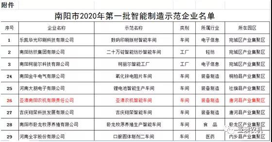 南陽市2020年第一批智能制造示范企業(yè)名單公布, 亞澳農機入選
