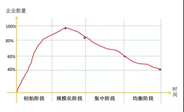 在一個(gè)行業(yè),從長期看,企業(yè)要存活下來就要有超出平均水平的成本控制能力。管理學(xué)家陳春花認(rèn)為一個(gè)行業(yè)內(nèi)企業(yè)數(shù)量和時(shí)間軸之間的關(guān)系可以通過四個(gè)發(fā)展階段來說明:初創(chuàng)階段、規(guī)?;A段企業(yè)數(shù)量一直上升,規(guī)?;笃谄髽I(yè)數(shù)量達(dá)到頂峰,開始有擠出效應(yīng),約20%企業(yè)出局,到集中階段又有20%企業(yè)出局,到均衡階段還要淘汰20%,最后的競爭就在剩下的40%企業(yè)之間展開。